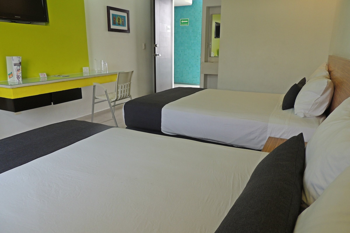 Hotel Central te ofrece amplias habitaciones con dos camas matrimoniales, smart tv de 43", minisplit inverter, cafetera, plancha, secadora de cabello. ESTACIONAMIENTO GRATIS RESTAURANTE WI FI SERVICIO DE SKY ROOM SERVICE LAS 24 HRS LIMPIEZA DE HABITACIÓN GRATIS POR DÍA Reserva tu hospedaje y obten cupones de descuento para nuestra área de restaurante. 1.-Descuento de 10% en room service 2.-Descuento de 10% en desayunos paquete 3.- Descuento de 10% en consumo de cerveza.