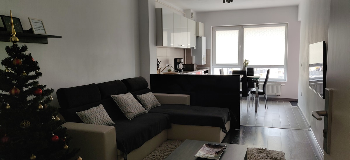 Enjoy a private space to call home during your stay in Brasov! Charming and cozy, our apartment is the perfect place to unwind after a day of exploring, with two flat screens, a huge sofa, a comfortable Kings Size bed and a balcony with stunning views of the Mountains surrounding Brasov. Quite neighborhood, with easy access to all major points of interest in the city. This place is perfect for couples, families, solo travelers or remote workers. Come to find out more!