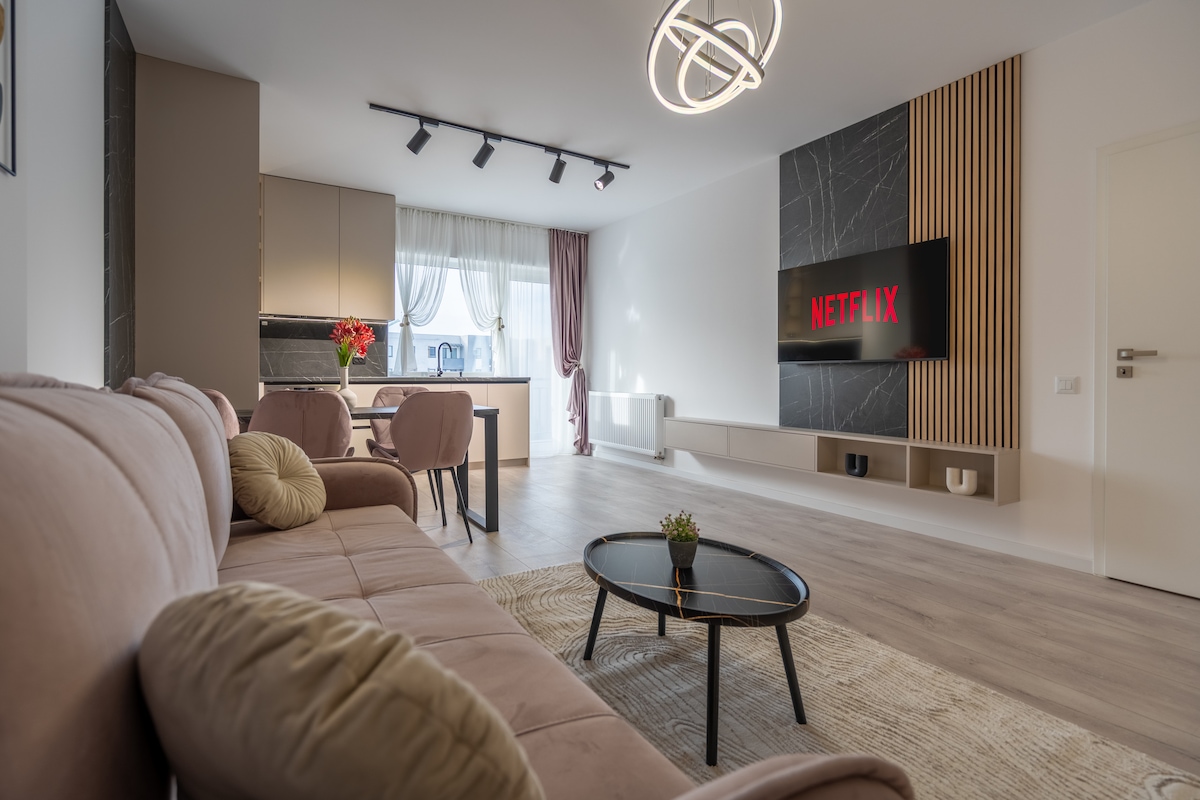 A uniquely and carefully designed, this apartment perfectly combines coziness with stunning Scandinavian accents. Situated in a new residential neighborhood, we go above and beyond to ensure a unique experience for our guests. Our home can accommodate up to 4 people and has its parking lot. The standout feature of this penthouse is the spacious terrace with a jacuzzi and a panoramic view over the mountains, being ideal for couples, business travelers, solo adventurers, or families (with kids).