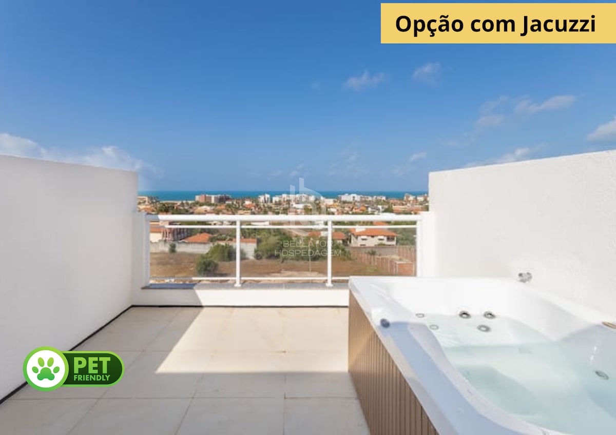 Triplex no Porto das Dunas, a menos de 30 minutos de Fortaleza e perto do Beach Park, com jacuzzi e vista incrível. Acomoda confortavelmente 5 pessoas em 2 suítes com cama de casal e 1 quarto com cama de solteiro, podendo receber até 6 hóspedes. Cada unidade oferece uma vaga de garagem; vaga extra depende de disponibilidade. O condomínio conta com piscina e deck para lazer.