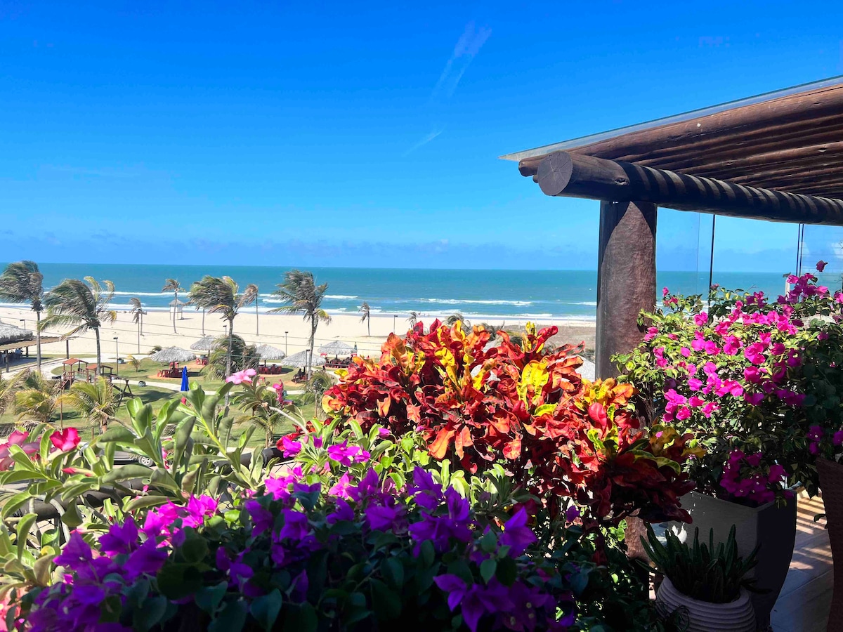 Aproveite o maravilhoso clima praiano do Ceará nesse confortável e completo condomínio pé na areia no condomínio de luxo Golf Ville. Ótimo apartamento novo, no térreo, com uma varanda com cortina de vidro com uma vista linda para o jardim, aconchegante, decorado, no maior resort do Nordeste, com restaurantes, muito próximo ao Beach Park. Viva momentos inesquecíveis neste lugar único e ideal para famílias. O Ar-condicionado da sala está funcionado, foi trocado e está novo!