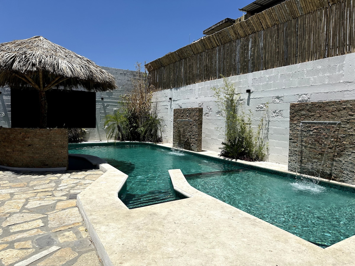 Hermosa casa unifamiliar. Ofrece piscina al aire libre con asador (el agua es a temperatura ambiente), frigobar, sala y mobiliario para exterior. Wifi gratuita. Estacionamiento para 2 autos medianos con portones eléctricos, 4 habitaciones(con baño privado, aire acondicionado y 2 de ellas con TV por cable)sala, comedor y cocina equipada con utensilios básicos, desayunador y 2 medios baños en áreas comunes.