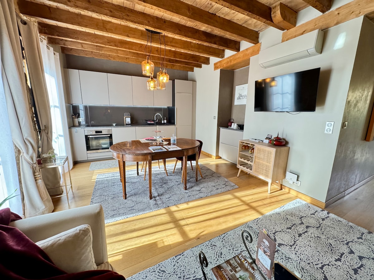 Apartment 85m2, Hyper centre, historic district. Spacious living room - 2 bedrooms One with a queen size bed transformable in 2 simple beds (80cm large) and the other one with a double bed (140cm)- Spacious kitchen - bathroom 2 sinks - separated toilets. Breathtaking view on the Place du Palais and Porte Caillhau. Elevator. Everything is just a stone's throw away! Docks, restaurants, terraces, shops, cultural. Garage (€20/day) only < 11:00am. No possibility to move the car during the stay !
