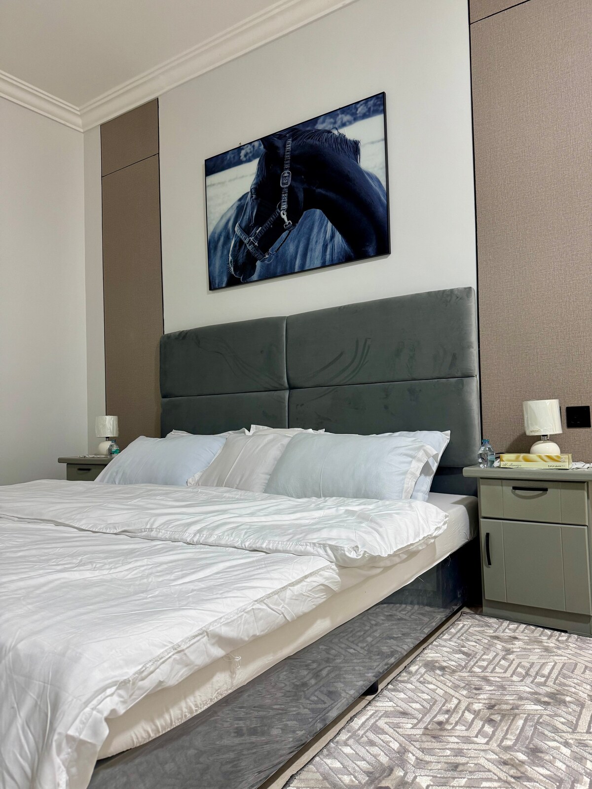 شقة فاخرة وأنيقة بعمارة جديدة وموقع مميز بدخول ذاتي لقضاء ليلة هادئة تتميز بروعة التصميم مجهزة بكل التفاصيل الجميلة لقضاء أجمل الأوقات وتتكون من غرفة نوم ودولاب تخزين ومنقي هواء مع اطلالة على شارع حيوي وصالة مميزة مزودة بإنترنت مجاناً وشاشة 65 بوصه مزودة بساوند بار من سامسونج مع اشتراك نيتفلكس مفعل وشاهد ويوتيوب ومختلف البرامج اهلاً بكم ضيوفنا الكرام .