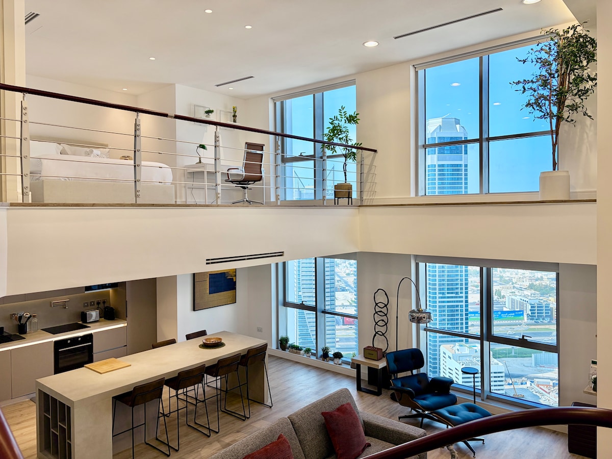 Experience our incredibly bright one-bedroom Corner Duplex Loft Apartment with stunning views of the lake & skyscrapers with floor to ceiling windows centrally located in JLT Dubai next to landmark neighborhood Dubai Marina. It comes with a designated desk area, projector, fully equipped kitchen & large balcony. The loft and JLT neighborhood are pet friendly. Hosted by seasoned Superhost & Airbnb Host Leader in Dubai.