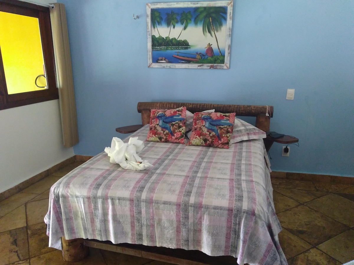 Além de uma ventilação natural extraordinária, o quarto oferece ar condicionado. Também um frigobar e chuveiro elétrico. TV tela plana 21", Netflix e WI-Fi. No quarto encontrarão kit de limpeza caso precisem e trocamos toalhas e lixo sempre que necessário.