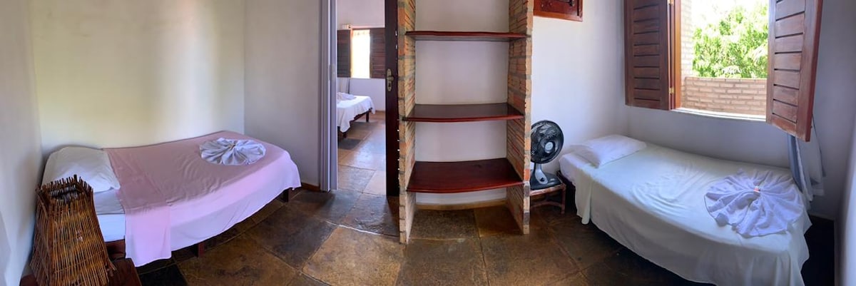 O quarto é amplo e aconchegante, com 1 cama de casal e 3 de solteiro, guarda-roupa, frigobar, água quente, e 2 ventiladores.