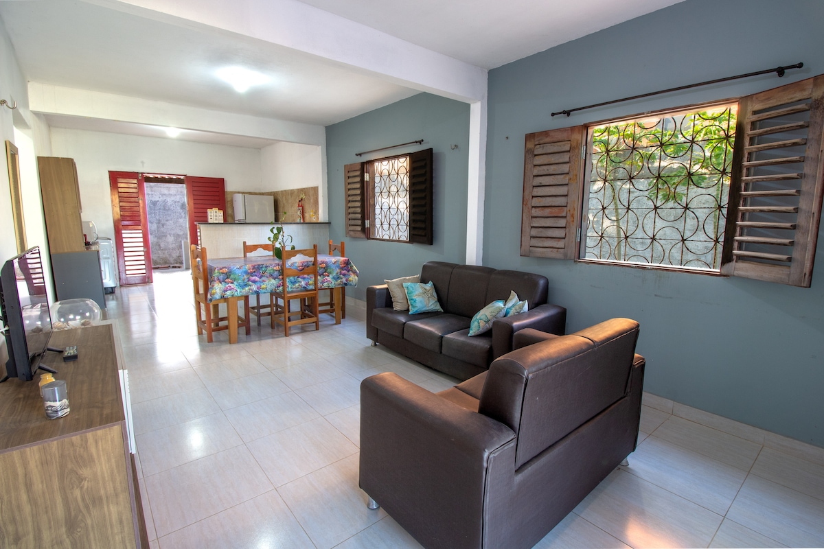 Casa de 2 andares, ampla e arejada, com varanda e vista para o mar. Está localizada a 100m da praia e 600m da rua principal (Broadway), num bairro tranquilo e rodeado de pousadas com segurança, próxima às barracas novas de Canoa. Os quartos possuem ventiladores e lençóis nas camas. A cozinha está equipada com o básico: pratos, talheres, copos, xícaras, panelas, cuscuzeira e liquidificador, além de alguns temperos. Há 2 banheiros , e uma ducha externa, no quintal