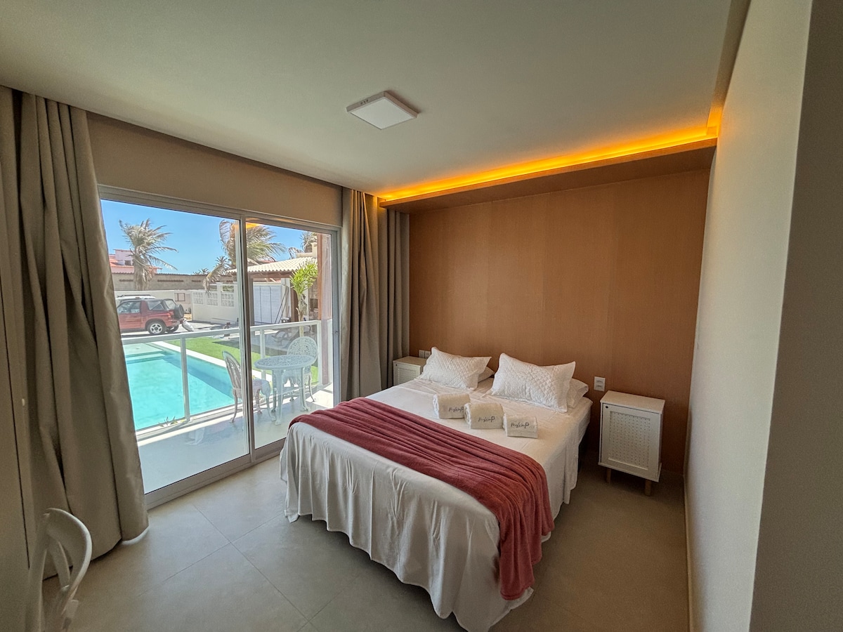 O apartamentos possui excelente localização, ficando a 450 metros da praia e 700 metros da Broadway; Apartamento no primeiro andar, possui um terraço privativo na parte superior com vista privilegiada do Mar e da piscina; Cozinha equipada com fogão, geladeira, Airfry , máquina de lavar e utensílios de cozinha. Comporta até 7 pessoas; Possui 2 quartos climatizados: Quarto 1 - cama de casal; Quarto 2 - : cama de casal + 1 cama de solteiro. Os 6° e 7° hóspedes ficarão em rede ou sofá .
