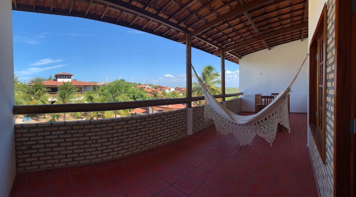 Apartamento superior com um quarto vista mar a 4km do centro de Canoa Quebrada, ótimo para quem procura um ambiente, seguro, tranquilo e familiar. Próximo a restaurantes, bares, mercados, farmácia, aluguel de carro e serviços de passeios de buggy, jangadas, parapentes e a uma distância de aproximadamente 200 metros da praia, excelente para caminhadas, apreciar o nascer e pôr do sol. Maré calma e temperatura agradável para relaxar e aproveitar.