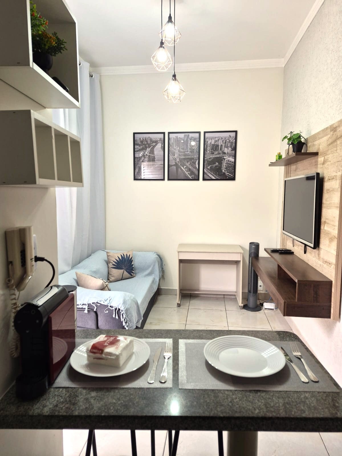 Apartamento aconchegante completo. Sanduicheira, liquidificador, Cooktop, Airfryer, microondas, ferro a vapor, secador de cabelo, panela de arroz elétrica, pipoqueira de silicone para microndas, utensílios básicos de cozinha, roupas de cama e banho de qualidade, cafeteira elétrica, travesseiros extras, cortina blackout, ar condicionado, geladeira, tudo preparado com carinho para proporcionar uma ótima hospedagem. Contém televisão com aplicativos de streaming. Wi-fi de alta velocidade