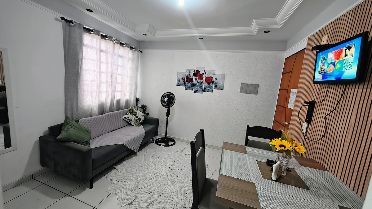 Preparado com muito carinho para que você se sinta em casa! O apartamento é todo seu durante sua estadia. - Cozinha totalmente equipada com utensílios. Possui geladeira, fogão, micro-ondas, cafeteira, sanduicheira Airfryer - 2 quartos amplos (ar condicionado e 1 ventilador) roupas de cama, cobertores e toalhas de banho. - Sala e copa com tv com canais e filmes, mesa de jantar e 1 ventilador. Internet Wi-Fi em todo o Apê. - Área de serviço com máquina de lavar - Banheiro com Box. - Playground