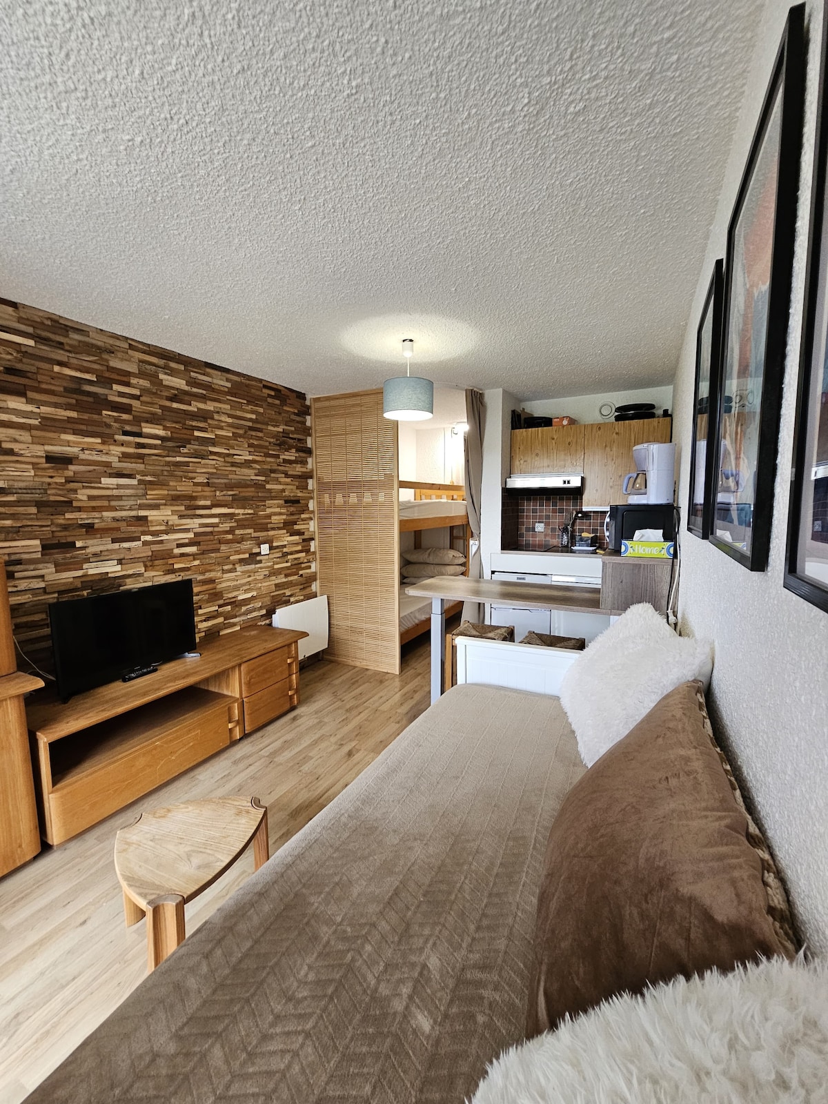 Appartement de 33m2 avec une chambre au 4ème étage, balcon au sud avec vu sur le domaine de ski. L'appartement est à 20m des pistes. Appartement pour 5 personnes : - 1 lits superposés de 3 places - 1 canapé lit 2 places - Télévision écran plat - Salle de bain avec baignoire - WC séparés - Casier à ski - Piscine intérieur, Sauna,Jaccouzi extérieur Non fumeur Linge de lit et serviettes de toilette NON FOURNIS (en supplément 80€)