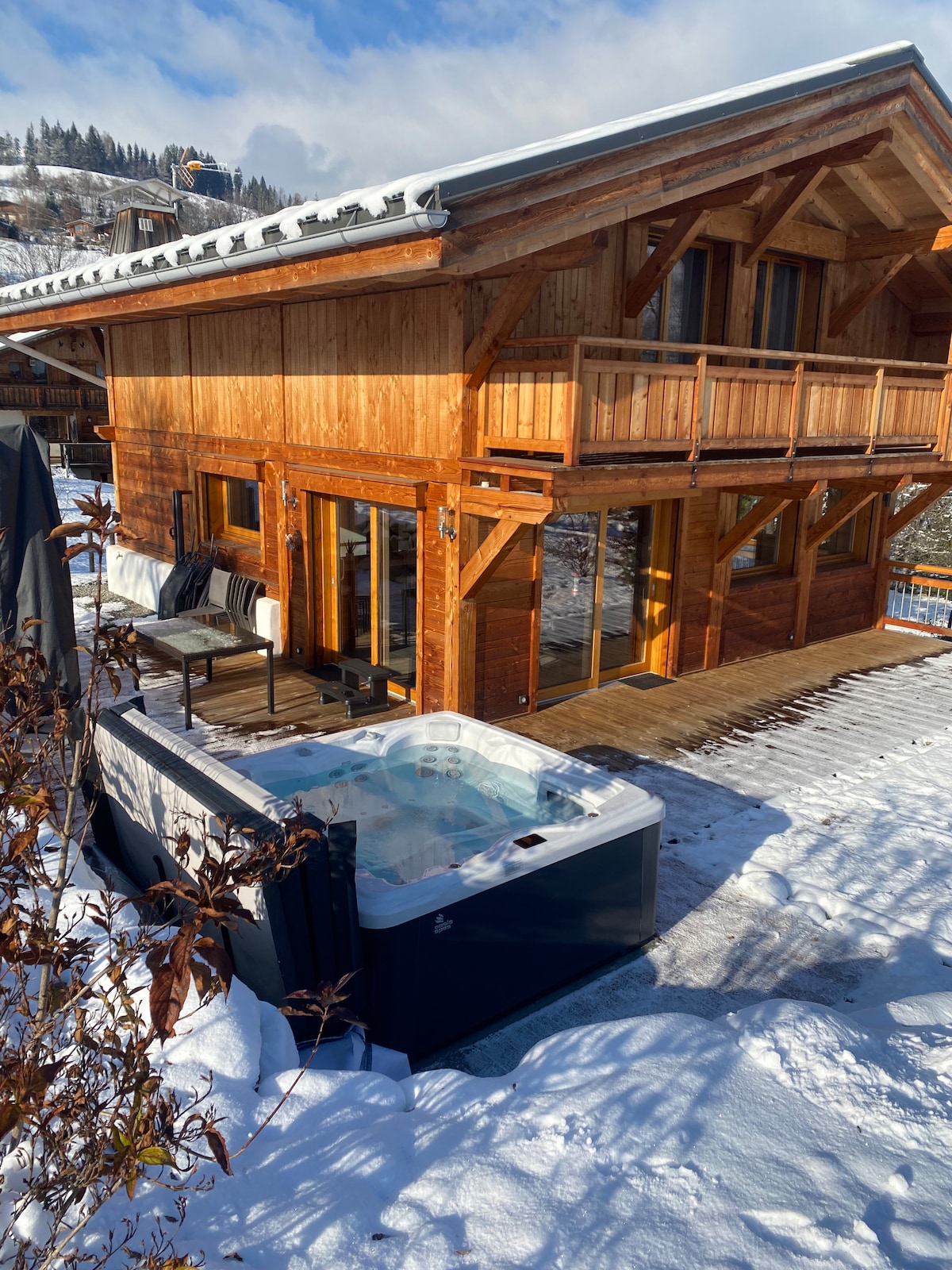 带室外按摩浴缸的勃朗峰景观度假木屋