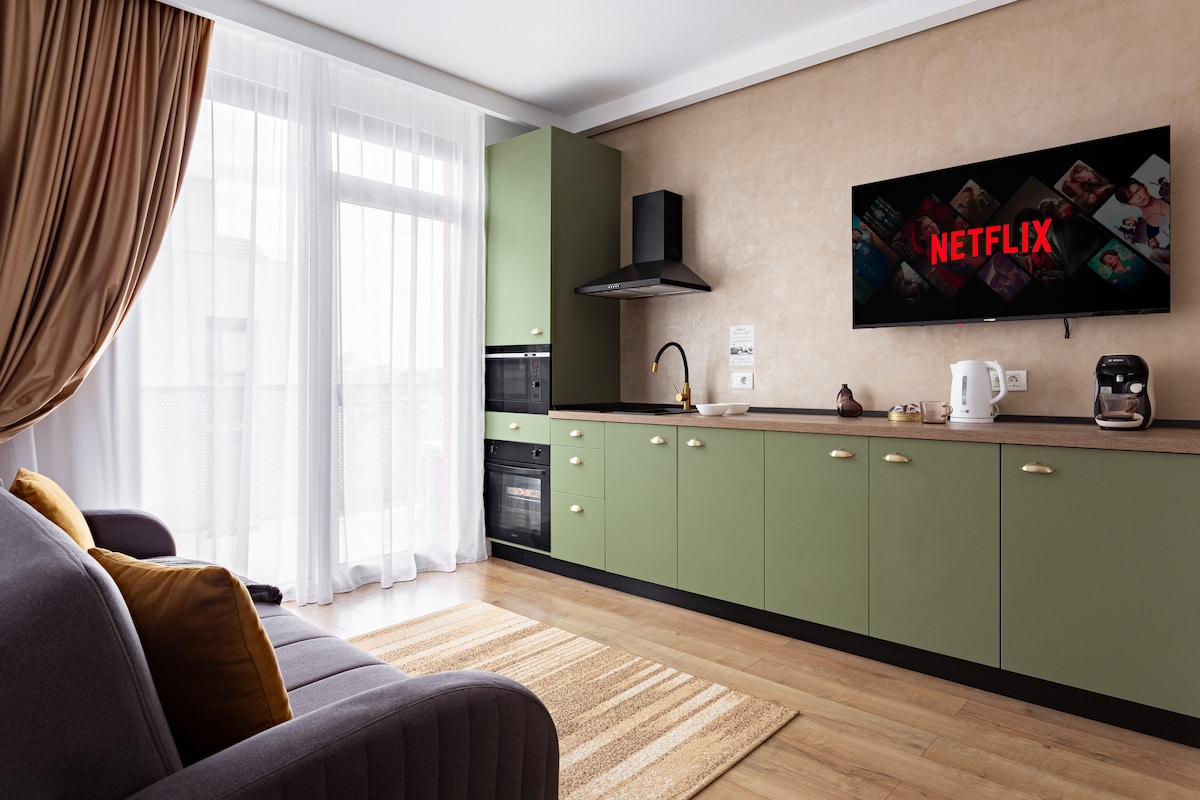 Modern and comfortable apartment in the center of Arad, perfect for relaxation or business. Fully furnished, with an open-space kitchen, cozy living area, air conditioning, and fast Wi-Fi. Located in a new complex with secure parking, just steps away from AFI Mall, it offers quick access to attractions, shops, and restaurants. Ideal for a city getaway or extended stays!