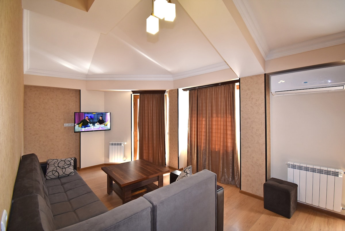 Located in the cozy Khachatryan street - this luxury 2BR apartment with a comfortable kitchen and huge balcony is ideal for your stay. 1st bedroom includes a king-sized bed with an entrance to the balcony. 2nd bedroom has single and twin beds. The bright living space featured a fold out sofa. Crib, stroller and high-chair are available upon request AC is available in all rooms. We provide 2 private parking lots. A huge supermarket is within the facility. Close to the downtown and metro station