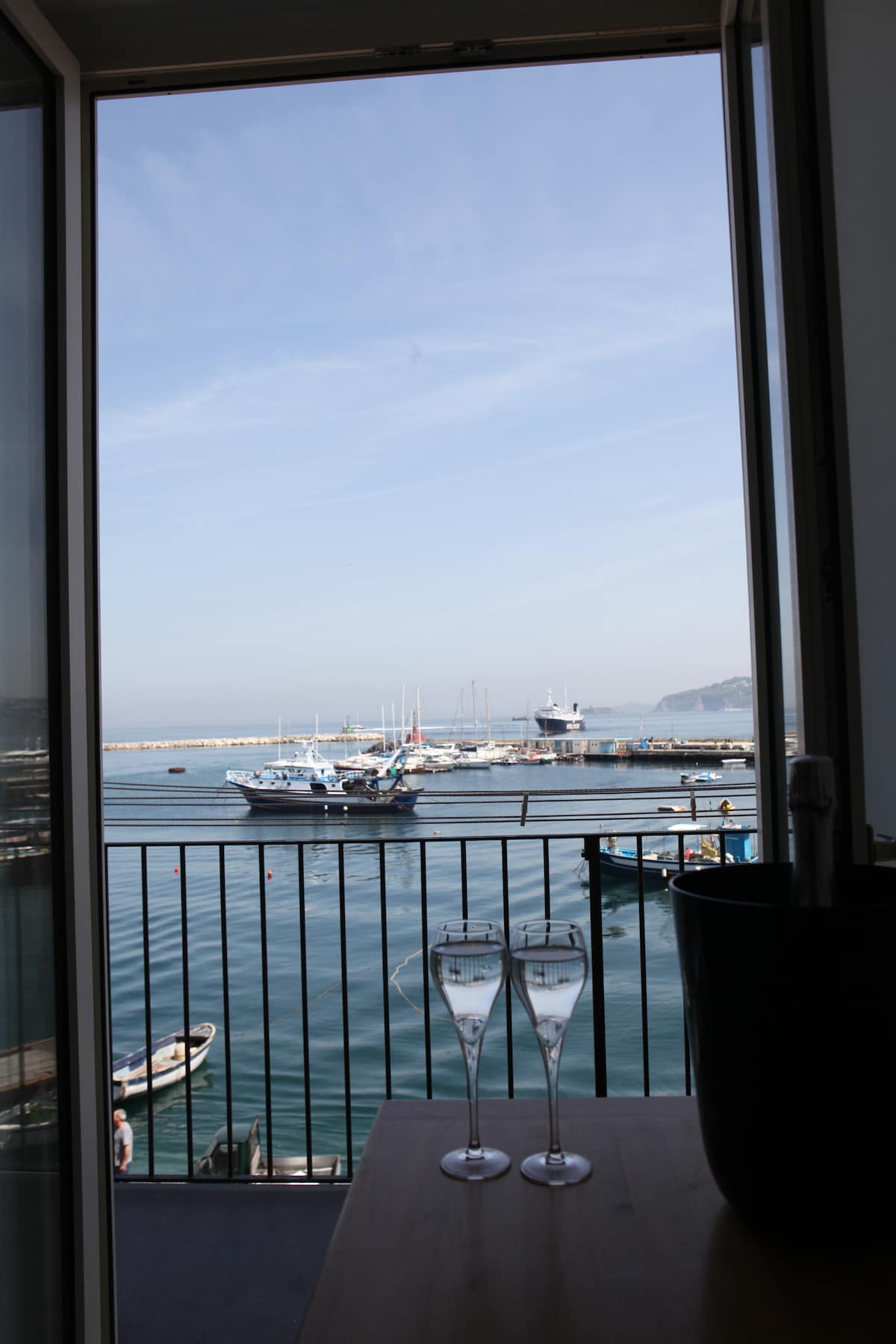 Newly refurbisced cozy apartment within a controlled traffic zone ,a minutes's walk from the sea.It has a wonderful view of the Aragonese Castle, the bay of Saint Anna and of Capri. The apartment has two bedrooms, two bathrooms, a kitchen/living room area and a laundry room. And it also has a spacius balcony wich surrounds the house and where you can have breakfast and sunbathe. It has all the mod cons: Wi-fi, tv, air condictioning, a fridge, and oven a washing