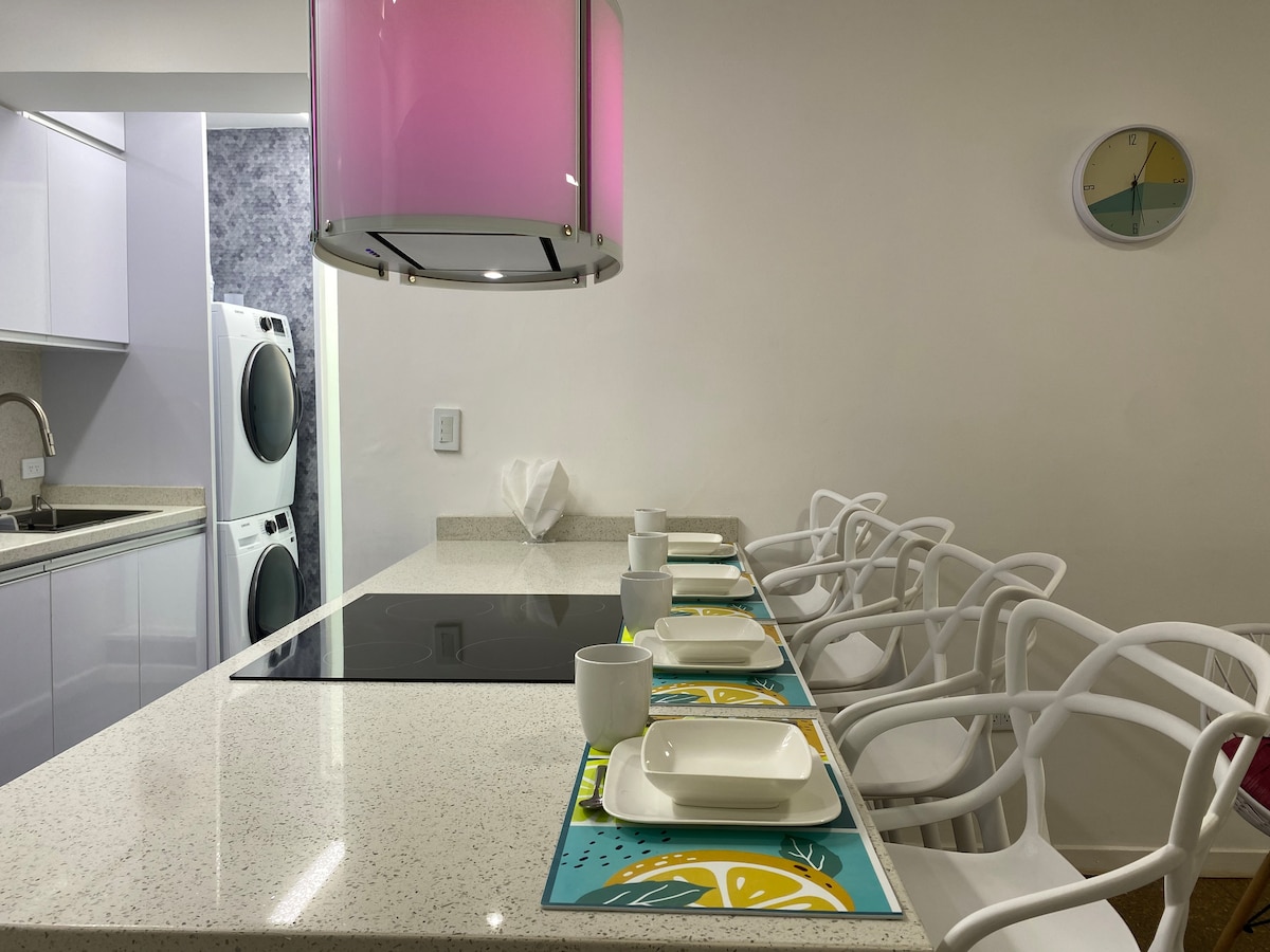 Elegante y moderno apartamento ubicado en Santa Rosa de Lima. Zona muy tranquila y bonita. Ideal para trabajar, descansar y vacacional. Tiene todos los servicios señalados y utensilios para una excelente estadía. Esta a 4 minutos de Las Mercedes, zona de entretenimiento de Caracas, muy cerca hay un supermercado y un centro comercial con restaurantes, farmacias, panaderías, línea de taxi, Spa, salones de belleza y otros.