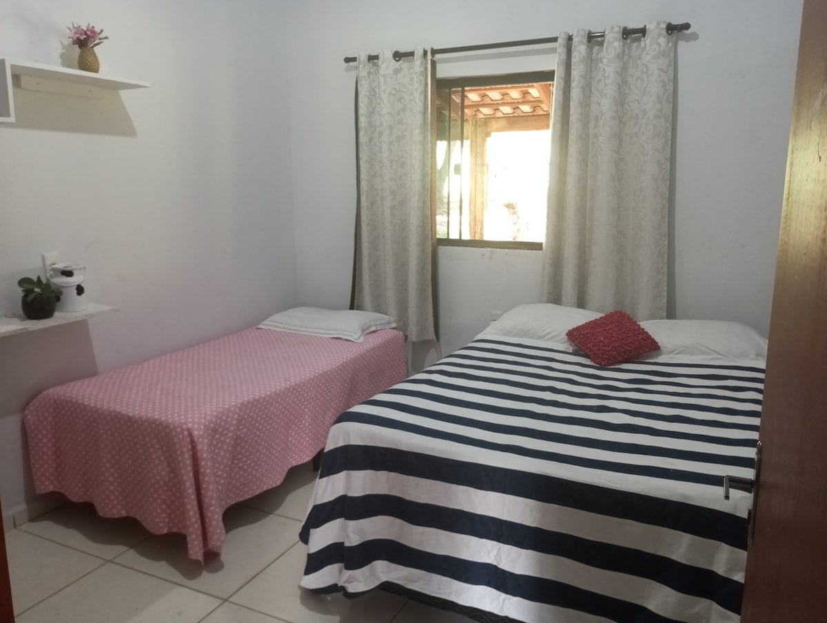 A Chácara Caminho de Cora à 10 minutos do centro histórico, em meio a natureza e a beleza do cerrado. Lugar tranquilo e aprazível. Quartos amplos, ventilados e bem iluminados. Vc irá encontrar muita tranquilidade. A casa equipada para 8 pessoas, possui três quartos sendo 1 suíte com ar condicionado e 2 quartos, 1 com ar condicionado e 1 com ventilador. Área de lazer, churrasqueira e piscina aquecida solar, ducha e banheiro completo próximo a piscina. Wi-Fi, Smart-TV, redes e área para fogueira.
