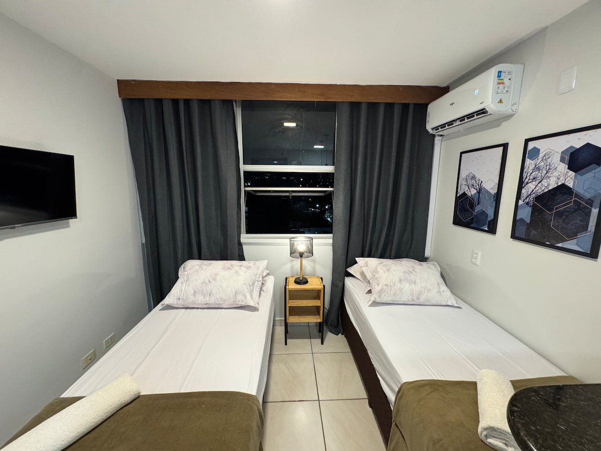 Loft alto padrão. Cama Queen hotelaria americana, colchão de molas ensacadas e látex. Cozinha completa para cozinhar c/ vários eletrodomésticos. Possui ar-condicionado Ótimo p/ trabalhar: escrivania, cadeira ergonômica, Wi-Fi alta velocidade (400 Mb). Disponibilizo toalhas e roupa de cama. Necessário enviar documento de identificação dos hóspedes, que só são autorizados a entrar no condomínio com esses dados do documento.
