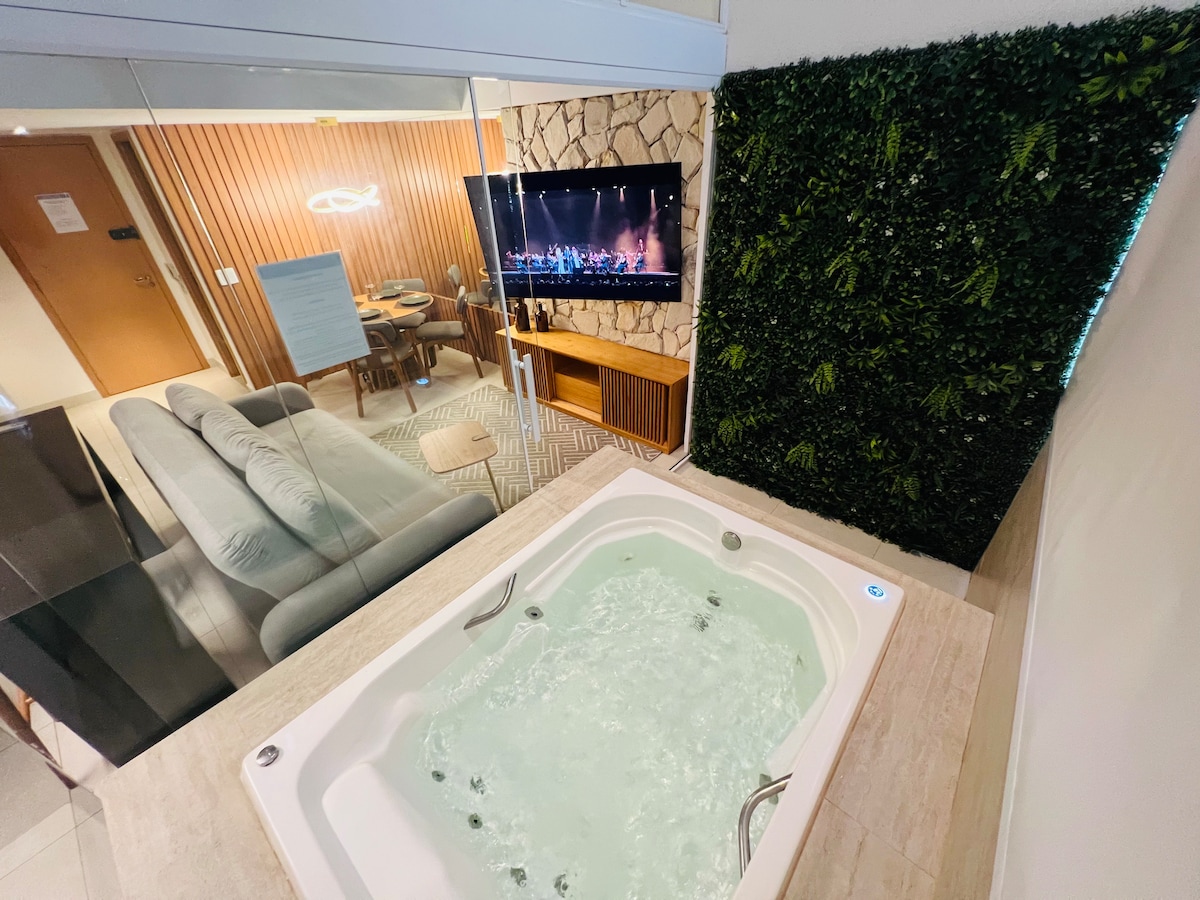 Agradável flat, com banheira de hidromassagem no ambiente interno, total privacidade. Nas áreas comuns, temos uma piscina de borda infinita, com uma linda vista da cidade, ofurô, sauna, belvedere, salão de jogos e brinquedoteca. Temos um mall, com cafés, restaurantes e outros. Localização privilegiada, próximo ao shopping, com um excelente polo gastronômico, ao lado do Parque e com fácil acesso para o aeroporto, bares e restaurantes.