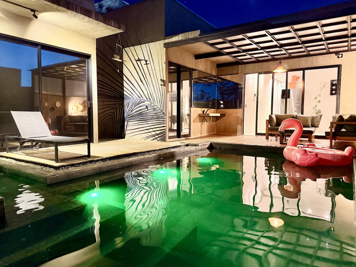 O Flat tem arquitetura assinada por um dos profissionais mais renomados de Goiânia. A idéia é você poder se sentir em casa durante a sua hospedagem. Tudo automatizado; luzes, cortina, TV, Ar Condicionado que oferecem comodidade e requinte, basta pedir para Alexa. Escute músicas, assista a mais de 1.600 canais abertos e fechados. Tome um banho gostoso com uma ducha generosa. Faça fotos e descanse na varanda com uma vista do por do sol sensacional e teto de acrílico.