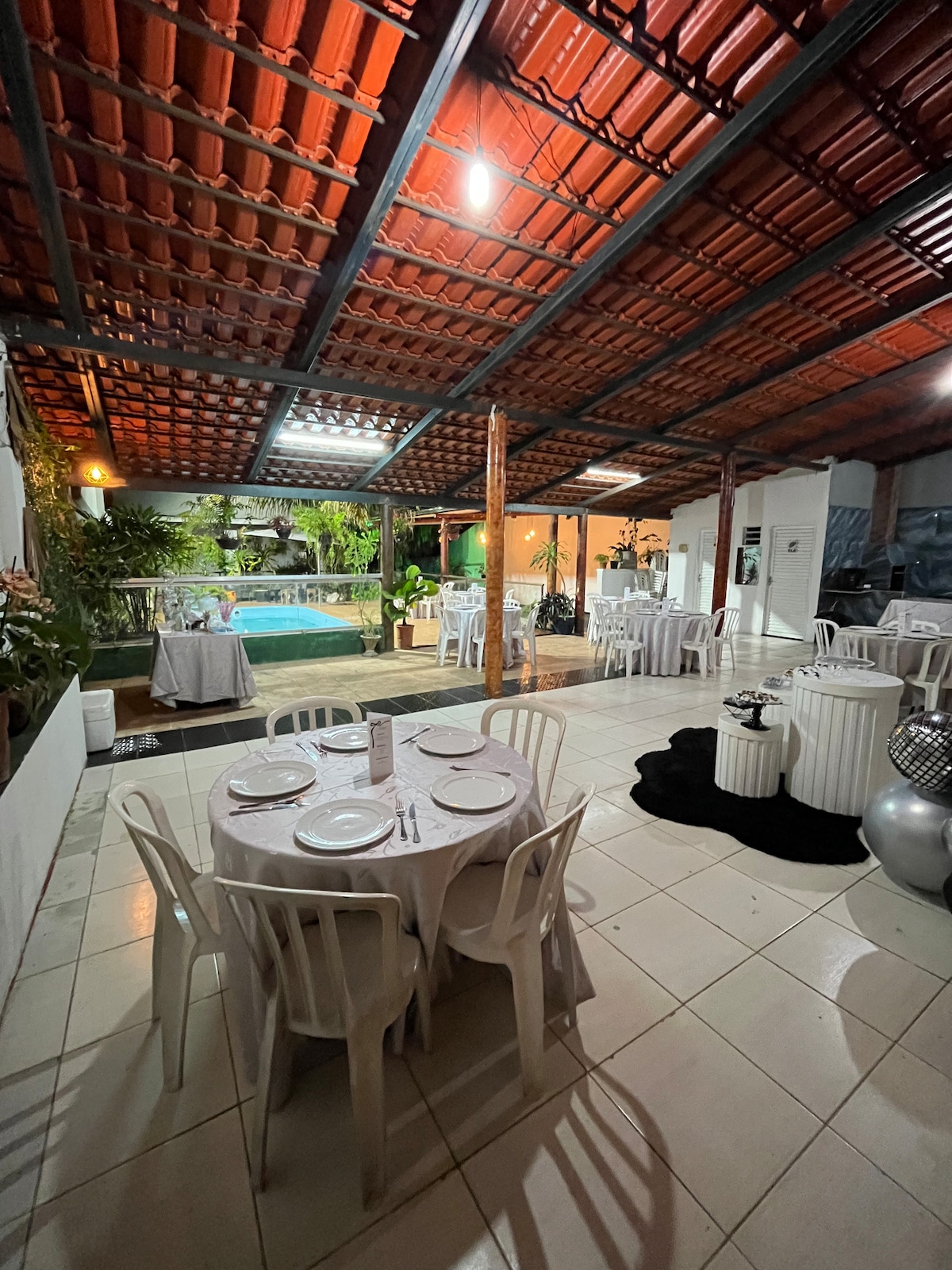 Fotos são ilustrativas do salão decorado, o que eu alugo para a temporada do Moto GP, é o salão sem mobilia, onde cada hospede traz e monta sua própria barraca, o ambiente é limpo e seguro conta com cozinha industrial e 2 banheiros seria apenas para dormir a noite e durante o dia seguir para o autódromo que fica a 2,5km, pode usar piscina e estacionamento para motos dentro do salão.