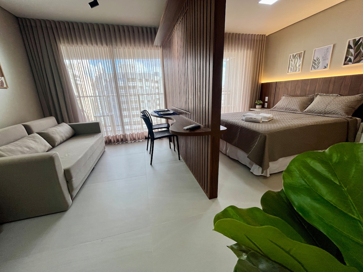 Prepare-se para ser cativado pelo requinte supremo deste distinto Loft em Anápolis, onde cada detalhe, desde os eletrodomésticos de última geração até a cama , proporciona uma experiência singular! Nosso espaço acomoda até 4 pessoas, com uma cama King Size e um sofá-cama de casal. Localizado a poucos metros do Hospital Ânima, da UniEvangélica estamos prontos para recebê-lo com todo o conforto.