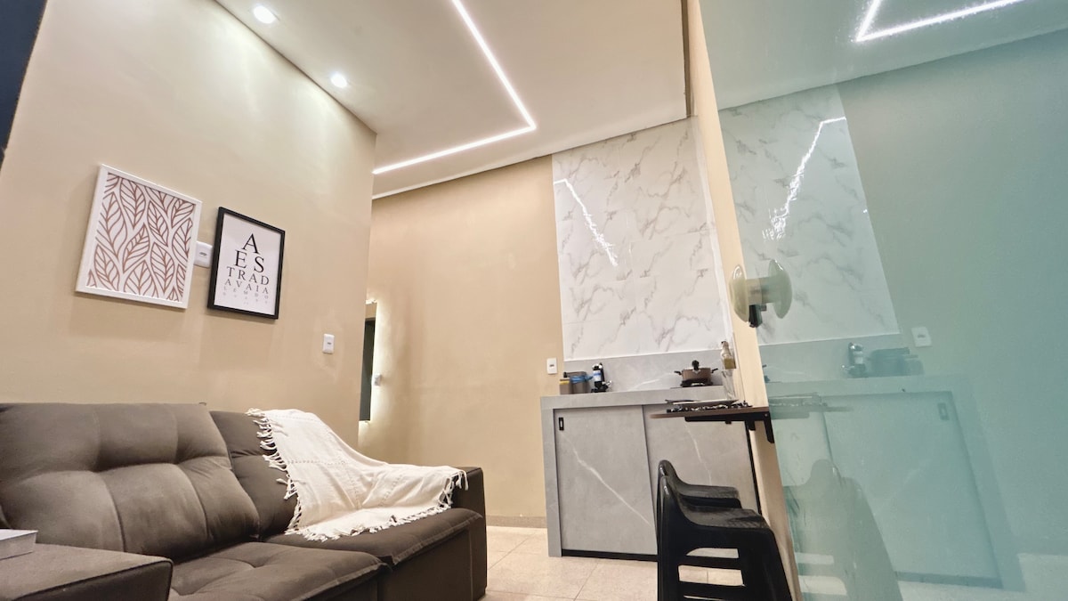 Casa completa há 3 minutos do Shopping e Via Lago. Temos 2 quartos: Um quarto c/ ar, tv, 1 cama de casal; E Um quarto com 1 cama de casal, guarda roupa e ventilador. Cozinha completa, no banheiro temos a opção de agua quente, e também um chuveiro externo. Wi-Fi, Garagem, câmera de monitoramento externa, cerca elétrica, portão elétrico, máxima segurança e comodidade. Nosso Check-in é de forma remota. Assim, você tem mais privacidade.