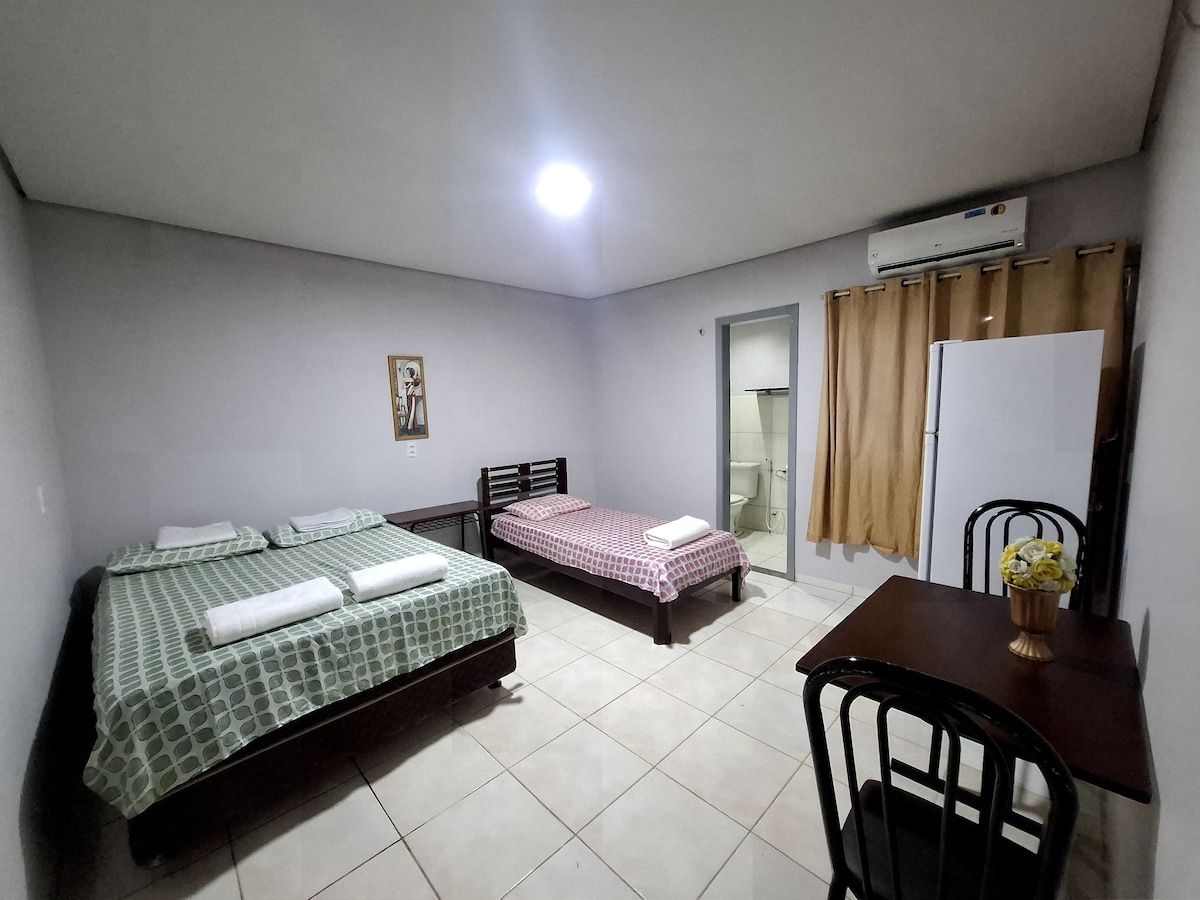 Bem-vindo à nossa kitnet acolhedora e confortável! Localizada em um bairro tranquilo e no centro da cidade, perfeita para ate 4 pessoas que desejam desfrutar de uma estadia agradável e relaxante. Com dois quartos confortáveis, um banheiro e uma garagem privativa. Ambos os quartos têm camas queen size confortáveis e espaço de armazenamento para suas roupas e pertences. Estamos ansiosos para recebê-lo em nossa kitnet e garantir que você tenha uma estadia agradável e confortável.