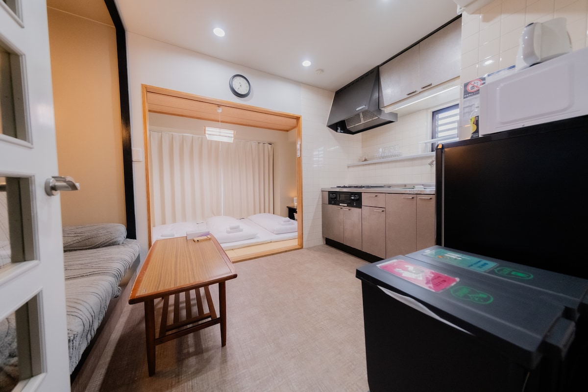 入住這間位處中心地段的房源,全家到哪都方便。 房內配置兩張加大雙人床,適合家人、朋友一同入住 床距舒適,動線保有獨立空間。最多可住5人 開放式廚房備有電磁爐、鍋具與碗盤,想吃家常菜、日式簡單料理都不是問題 吧台連接生活與用餐空間,不論是一杯早晨咖啡,還是一頓晚餐,一切都剛剛好。 洗手台與衛浴獨立設計,幾個人一起住也能保有自己的步調 提供藍芽音響,在日本的夜晚聽著音樂、泡個熱水澡是旅途中最放鬆的片刻。 房內備有投影機,可輕鬆連接常用的數位串流平台 洗衣機、空氣清淨機、熨斗與寬敞衣櫃一應俱全,你需要的,我們都準備好了 空間剛剛好,適合一個人靜靜地在吧台工作,也適合和朋友或家人一起住上幾天 自在相處,各自舒適。