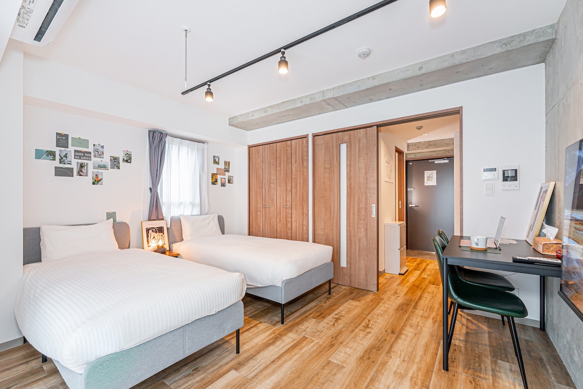 NEW 駅近3分、ワイドダブルベット.出張&カップル、コンビニ、wifi、乾燥機能つき洗濯機