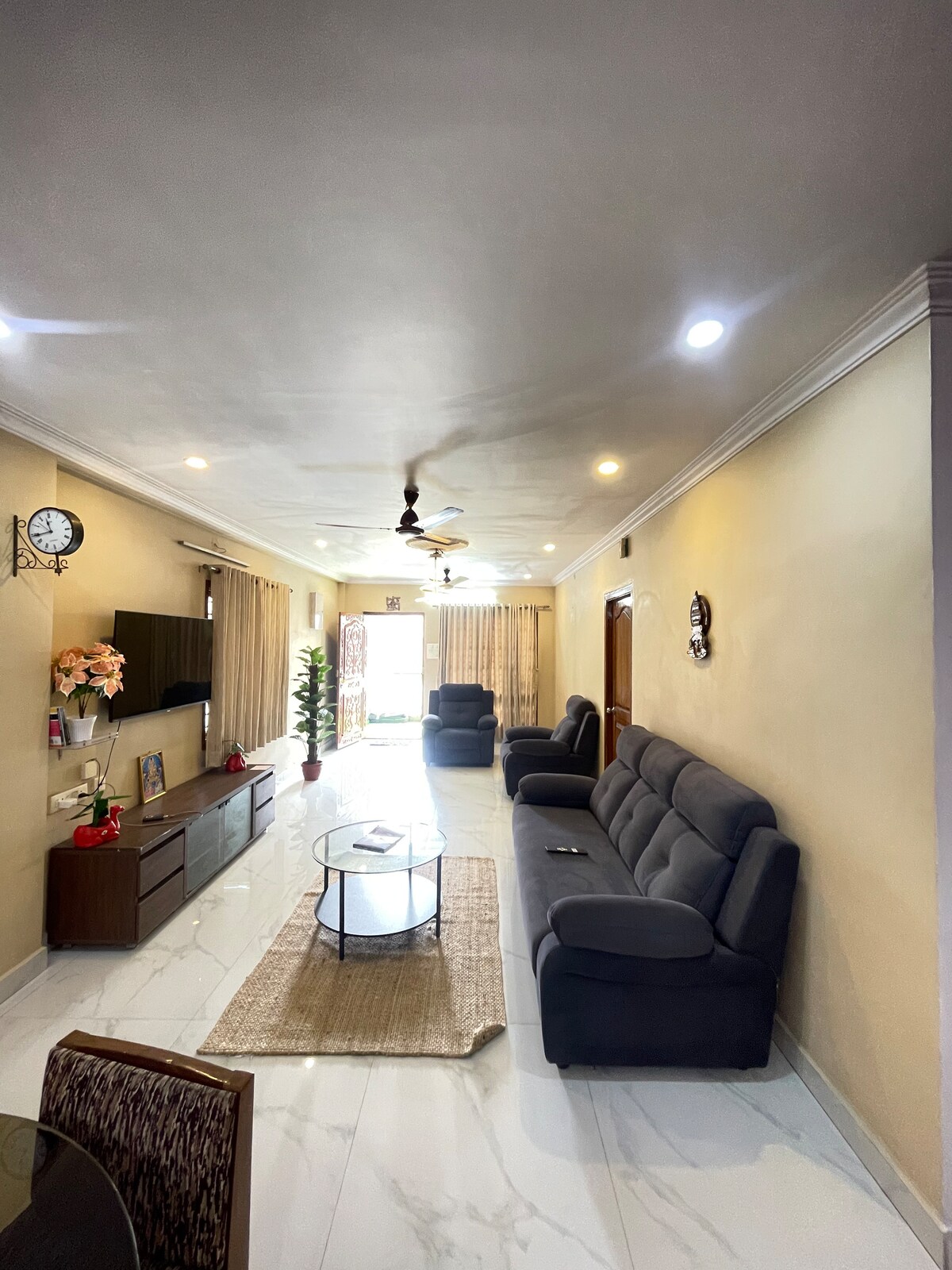 A luxurious coastal escape just steps away from pristine sandy shores. Nestled in the city centre this homestay offers an idyllic retreat for Families, Working Professionals, Corporate meetings & Reunions and Weekend Getaways. Enjoy a fully equipped modular kitchen, cozy living area, home theatre and an open area of the ocean view! Along with our unparalleled hospitality this is your perfect home away from home.
