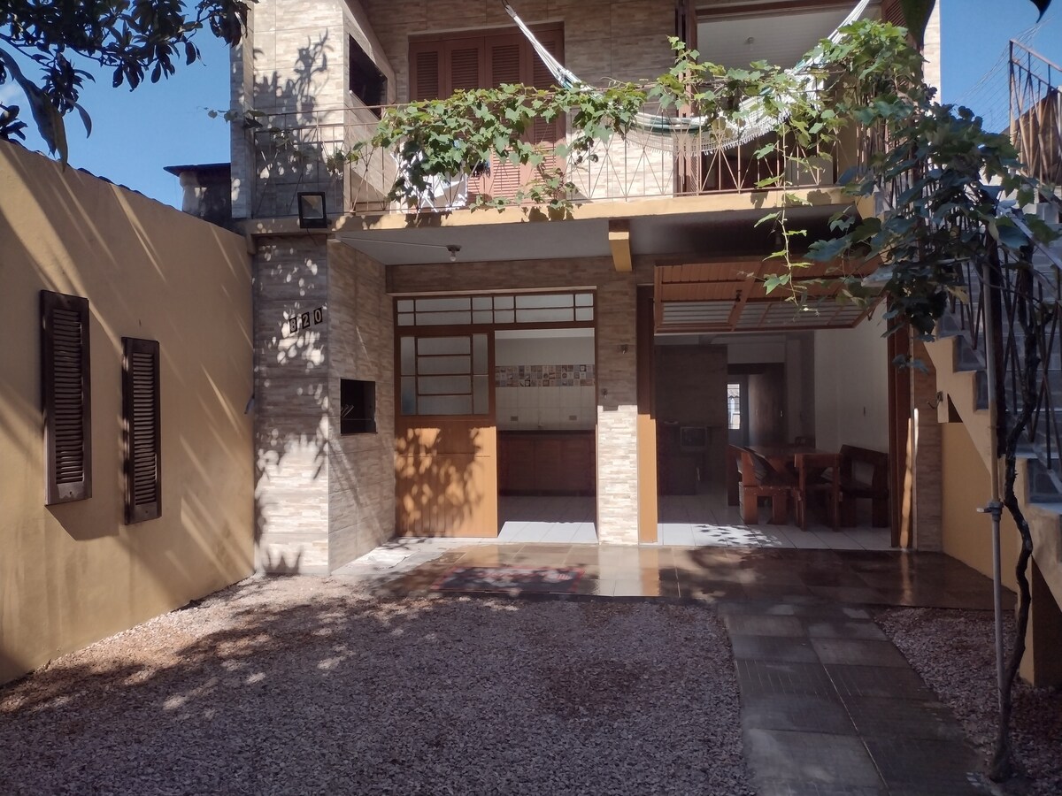 Super nova, piso superior. Rua Gustavo Emílio Xavier,760. No Centro, 1 quadra do Mercado Machado e a poucos minutos da praia a pé. Ar condicionado, 3 quartos (4 colchões solteiro e três casal) e dois banheiros(1 suíte), lavanderia, água em jato pressurizado, churrasqueira no terraço com área de lazer no térreo, casa bem arejada com mais de 84m2 além de área de lazer privativa no 3° piso. Toda em tela mosquiteiro . Estacionamento incluído. Casa inteira e bem central.
