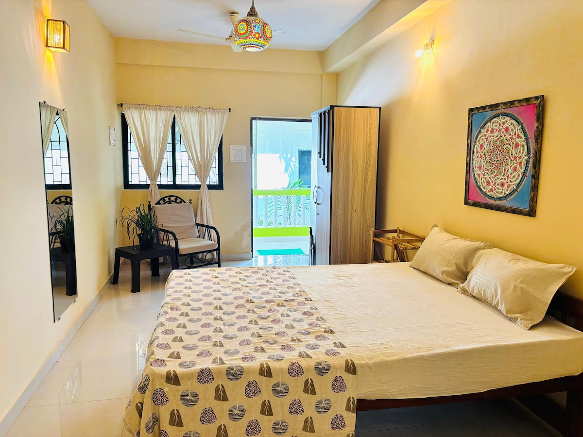 Forget your worries in this spacious and serene space. "Experience comfort and convenience in this tastefully designed 1-bedroom(Air Conditioned Bedroom) fully furnished apartment, located in the heart of Arambol. With a blend of modern and cozy interiors, all important amenities, and a central location, it's the perfect retreat for both short and long stays." - HighSpeed WiFi - Security Camera @ Entrance - Weekly Housekeeping Service included for long stayers. ( Linen,Floors, Toilet)