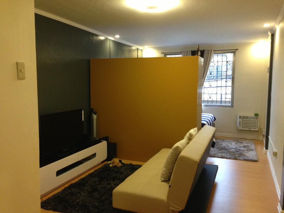 Our lovely space has fast Wi-Fi, Samsung 55' UHD Led TV with Youtube and Netflix! Perfectly nestled at the heart of Quezon City where entertainment, shopping, and food destinations are a quick walk away. Your view by the window composes of swimming pools and cabanas in a grassy landscape. Perfect for couples and small family travelers, be close to everything when you stay at this centrally-located homey place. Space is practical, relaxing, and vibrant in a secure spot in the middle of it all!