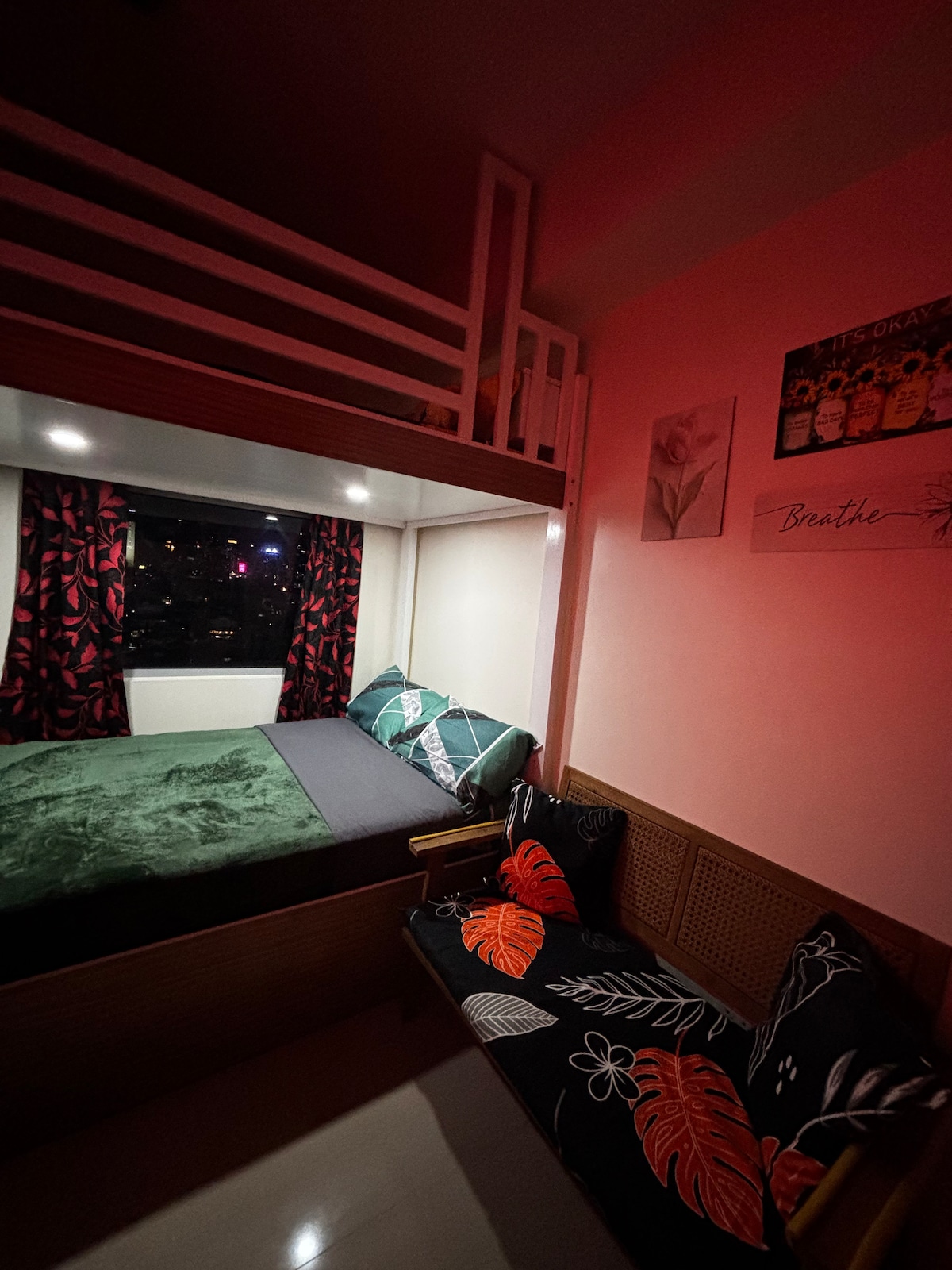 Welcome to your Clean, and modern home in Eastwood City! This Modern, stylish condo is perfect for business travelers, couples, and staycations. ◆ Hotel-quality queen bed for a restful sleep ◆ Modern lighting and bright, relaxing interiors ◆ Full air-conditioning for all-day comfort ◆ Fast WiFi ideal for work or streaming ◆ Smart TV with Netflix & YouTube ◆ Well-equipped kitchenette ◆ Clean bathroom with hot & cold shower ◆ Soft couch & warm layout perfect for unwinding after a long day
