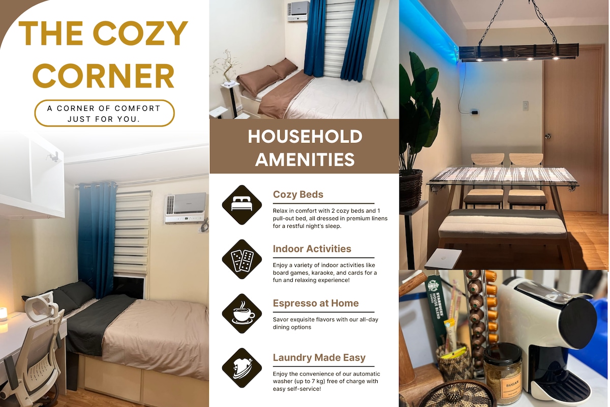 Enjoy our luxury home concept that connects all the guests in an incredible way. The functionality of the kitchen, dining, bedrooms among others is extremely gracious and fully air conditioned. The cinematic hotel experience with videoke in a staycation right in the heart of Makati. Chill and relax in a fully furnished master suite with Lazy boy and en suit jacuzzi! SUPER CONVENIENT! Bowling, billiards, massages, an authentic Korean sauna, resto bar and lively karaoke—all within a 3-min walk!