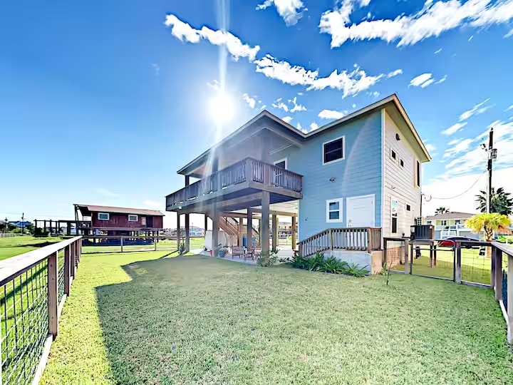 Dockside Delight Beach House in Rockport: a 3-bedroom, 2-bathroom stilt home on a waterfront canal. Perfect for fishing or beach trips, this recently remodeled home features a spacious upstairs deck with views of the canal and Salt Lake in the distance. Inside, you’ll find 3 bedrooms: two with queen beds and one with twin bunk beds. Enjoy the charm of Rockport and make Dockside Delight your next getaway destination!