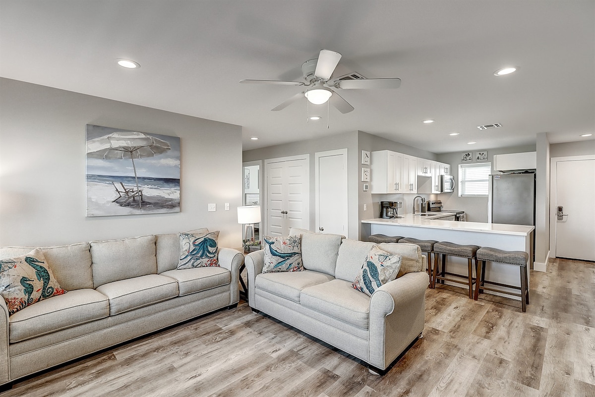 经过改造的海滩风格2卧/2卫-泳池景观,步行可至海滩