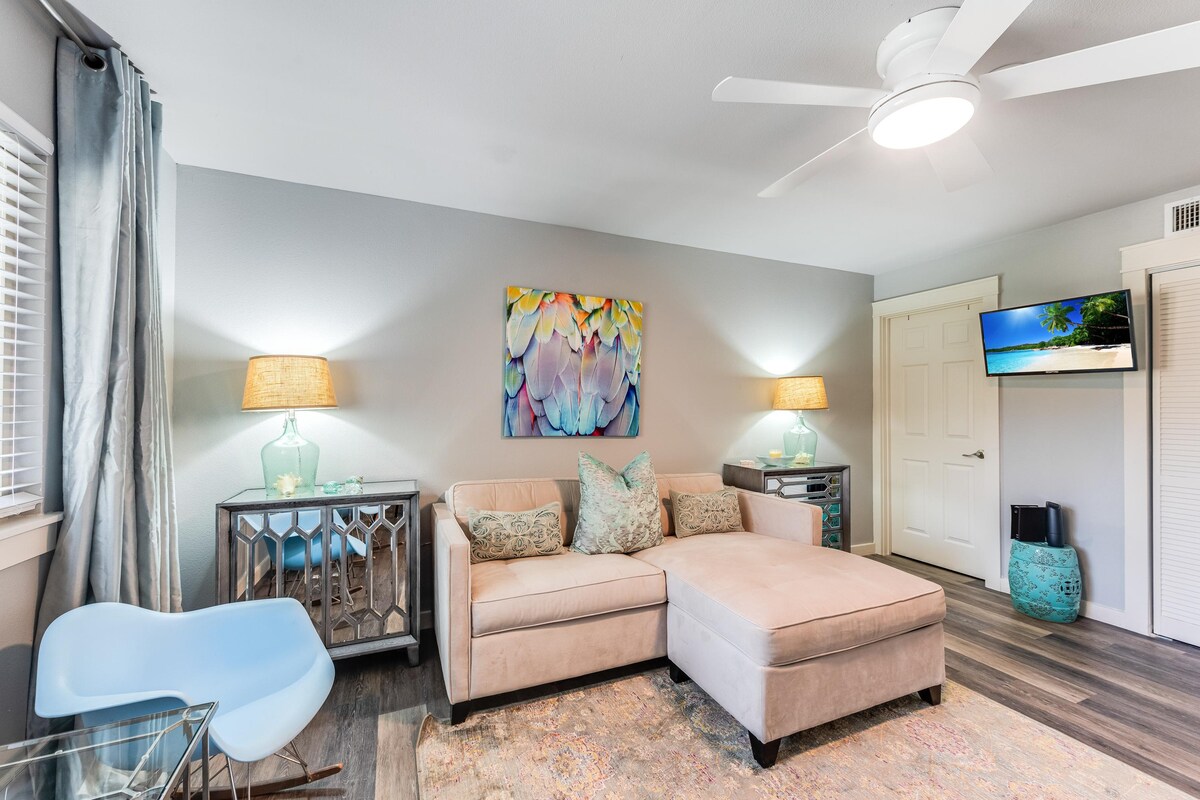 Third-coast cool and ready for your island getaway, the Quarterdeck is in the heart of Port Aransas and only a few blocks from the beach, restaurants, nightlife, and shopping. This 2-bedroom, 1-bath is in a great location, in Pirate's Cove. We welcome up to two dogs with a combined weight of less than 100 pounds (except aggressive breeds). There is a $50 per dog fee to help with cleaning. We ask that you kennel your dog when left alone and pick up after them when they do their duty.