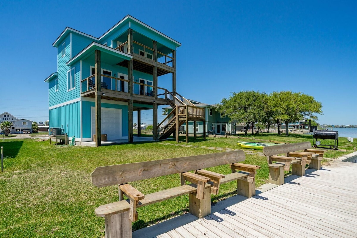 Your Rockport adventure starts here! This canal-front retreat features a private fishing dock, boat launch, kayaks, and multiple sky decks for incredible sunsets and wildlife views. Enjoy a golf cart for cruising and an outdoor kitchen & living area with BBQ for relaxed waterfront meals. Pet-friendly and perfect for families, couples, or friends looking to fish, boat, and explore Rockport’s beaches. Enjoy cool coastal breezes, peaceful mornings on the water, and laid-back coastal living.