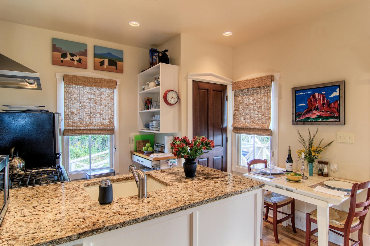Super cute cottage style accommodations that are ADA friendly. The cottage sits on a beautiful piece of property full of mature trees tucked away in a quiet neighborhood. Well appointed and complete with a kitchenette that includes a microwave, refrigerator, and coffee maker, a full size bathroom with a fun, custom made locking barn door. The decor is coastal and the artwork is all by local artists. You’re sure to enjoy this cottage that was built and completed on the inside by a woman.