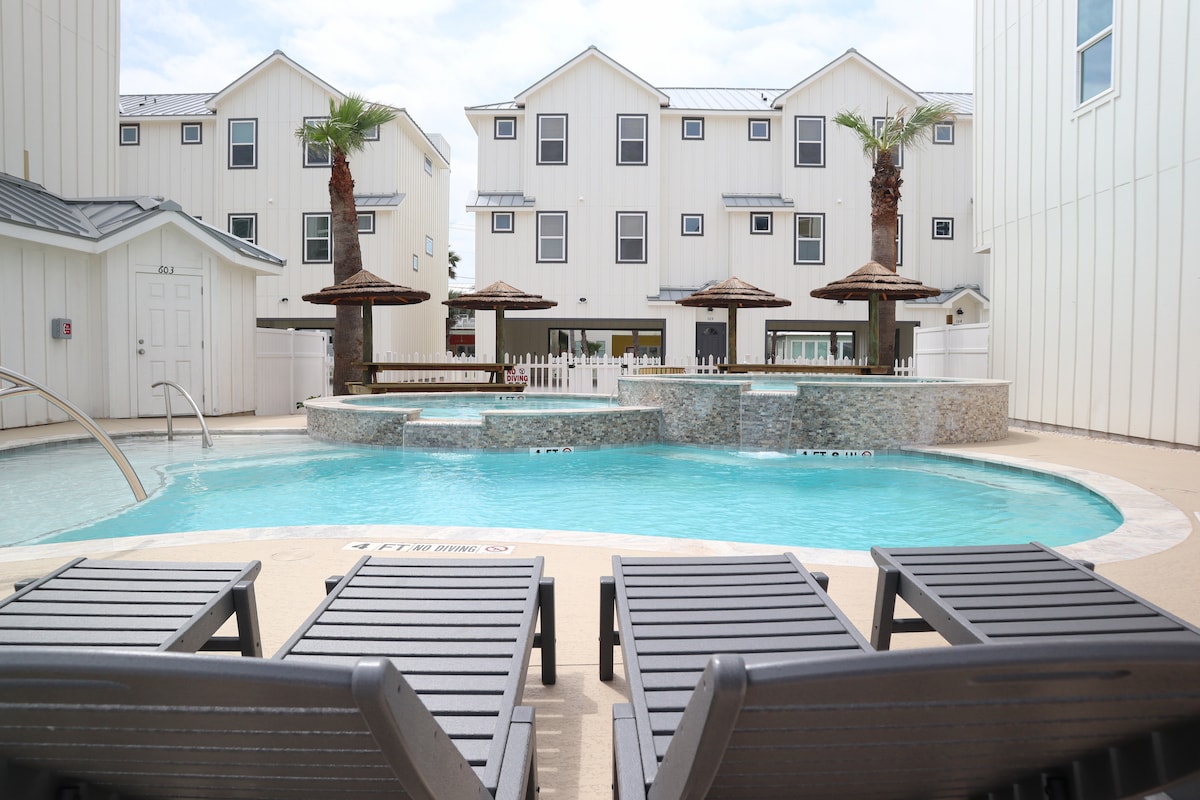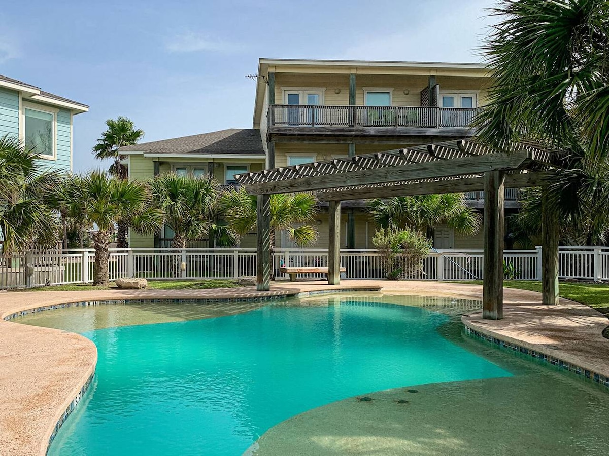 ★ “We had a wonderful time at this beautiful townhouse. There was a lot of room for us to move around and the pool was amazing! We will be back!” ★ • Crystal-clear shared pool + heated in winter • Stylish 3BR/3BA townhome sleeps 9 • Cozy living room w/ pull-out seats • Fully equipped kitchen • Spacious bedrooms • Golf cart-friendly + walking distance to downtown Port Aransas • Onsite washer + dryer • WiFi 4 mins → Port Aransas Beach 6 mins → The University of Texas Marine Science Institute