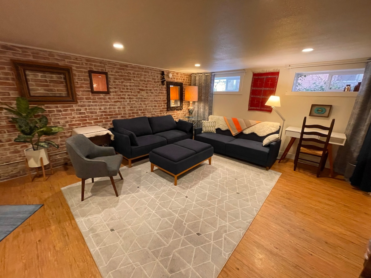 Remodeled in 2023, this funky apartment in our home is separated from the upstairs with private keypad entrance. New kitchenette & bathroom, eating/work area, cozy living room and access to beautiful backyard. Location is steps to Light Rail, nestled between Downtown and the Denver Tech Center. As a basement unit in our house, best for low key couples, biz travelers, DU visitors, tourists, cannabis consumers, LGBTQ+ folks, honeymooners and Red Rocks concert goers. Ask to use Level 2 EV charger!