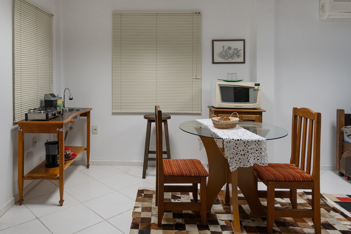 Conforme fotografia, pia, fogão de bancada, pedras em granito, cozinha conjugada. condicionador de ar. Localização privilegiada no bairro anita Garibaldi: próximo ao centro, cama de casal, cabo de rede. fácil acesso a BR 101, próximo a shopping, faculdades hospitais. a uma distancia de uma pequena caminhada tem acesso a lavanderia, cafeterias, restaurantes, , etc Esta unidade é compacta e ideal para pessoa sozinha ou casal porém possu i cama auxiliar ideal para uma pessoa.