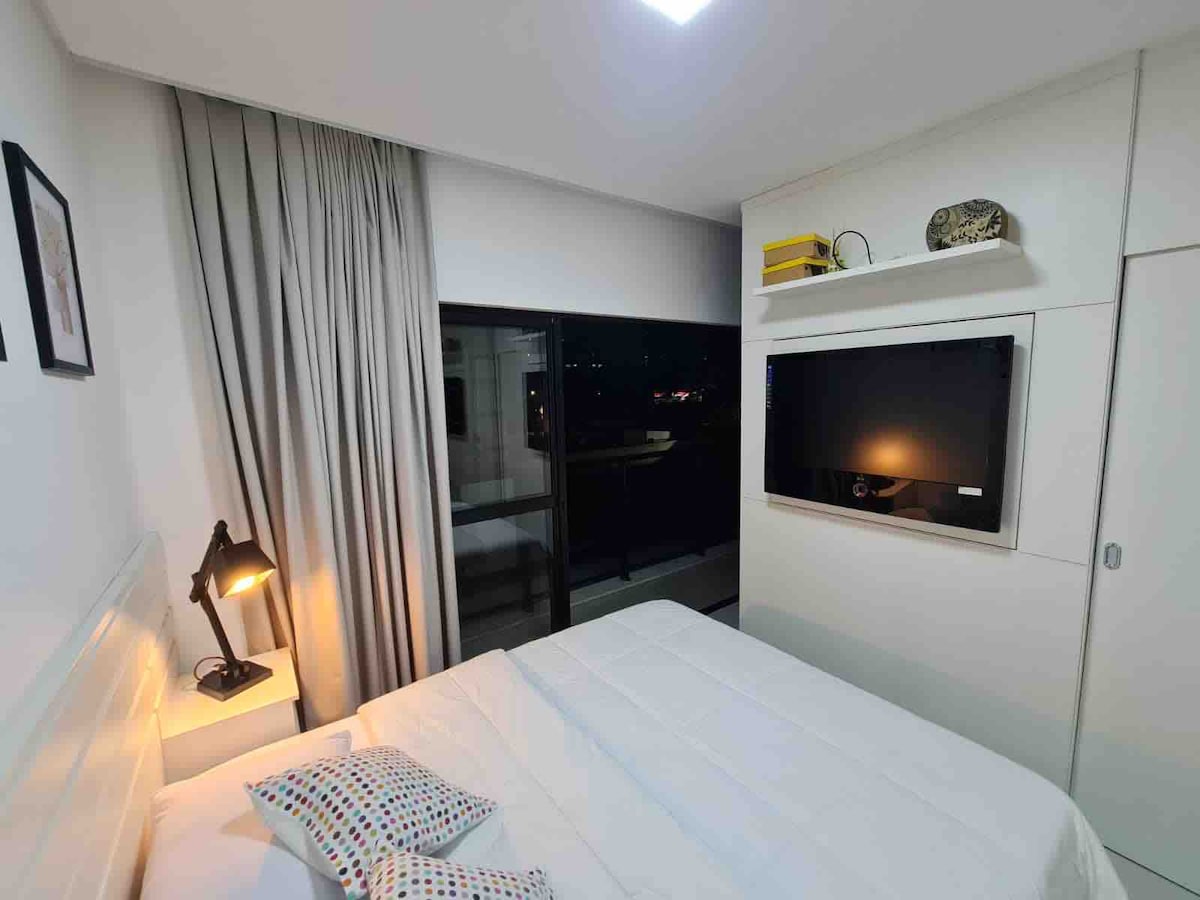 A lazer ou a trabalho, próximo a bares, restaurantes, shopping , farmácia e supermercado! Loft moderno, totalmente equipado, com internet rápida , ar condicionado, fogão e forno elétrico, geladeira , microondas, liquidificador, cafeteira, chaleira elétrica , secador de cabelo ,ducha higiênica ,lavadora e secadora de roupas, varal de teto e de parede. Dormitório com cama queen e armários, smart tv em base giratória para atender a sala e o quarto. Sacada com sol da manhã e garagem privativa !