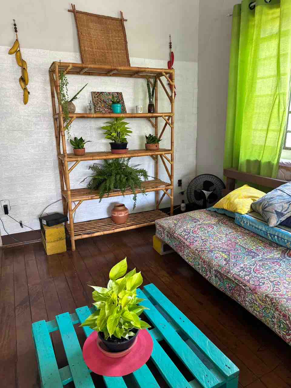 Apartamento do tipo studio aconchegante e bem localizado que acomoda confortavelmente 3 pessoas, podendo acomodar até 4, caso necessário. Dispomos de uma cama tamanho casal-padrão, uma cama solteiro e um colchão solteiro-padrão. Para acomodar 4 pessoas um colchão é colocado no chão ao lado da cama de casal.