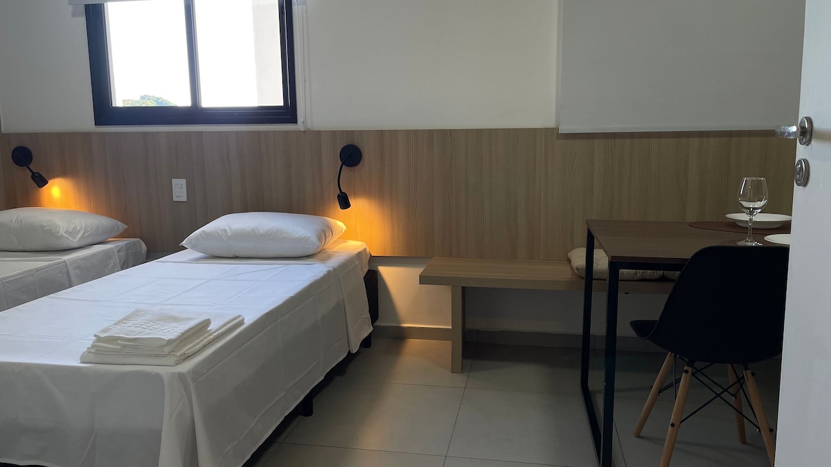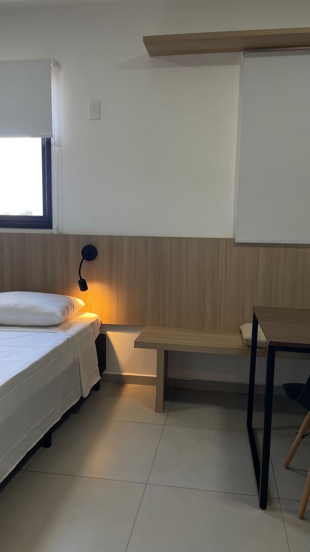 Studio contém ar condicionado, geladeira, TV, purificador de água, cama de casal, guarda-roupas, fogão elétrico, podendo ser utilizada área de coworking, sala de jogos, academia, bicicletário, garagem (rotativa), sala de cinema, máquina de lavar roupas e secadora (grátis ou paga).