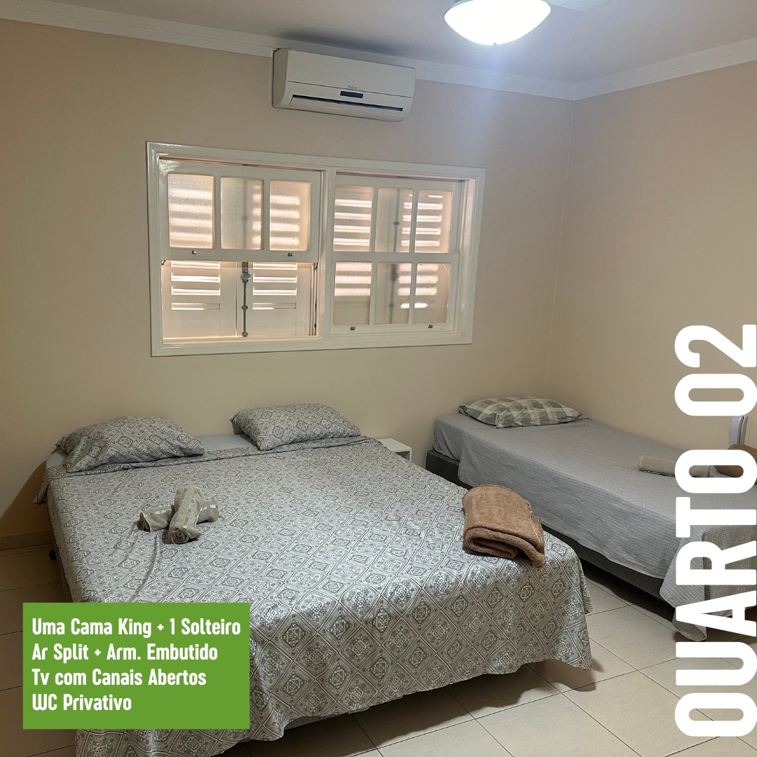 A Casa Uvaia é um espaço acolhedor e aconchegante. Com excelente localização em área central de Araraquara, é perfeita para pequenos grupos de amigos, reuniões familiares e acomodações de funcionários de empresa. Possui uma ampla área verde, proporcionando momentos de lazer em sua estadia. No primeiro piso temos uma suíte com cama king size, cabideiro e mesa de trabalho. No banheiro temos hidromassagem e secador de cabelo. Na sala ao lado temos bicama. ambos com varanda e vista ao jardim.